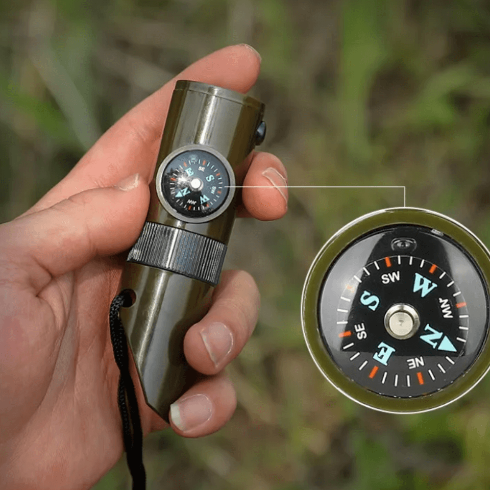 7-i-1 Overlevelses Fløjte - Kompas, Lommelygte & Forstørrelsesglas (FJERNLAGER 15-25 dages levering)