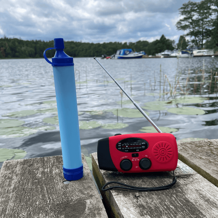 Regeringen anbefaler, at du har 10 liter rent drikkevand pr. person til nødsituationer. Dette kompakte vandfilter kan rense op til 1.500 liter vand – svarende til en måneds forbrug for en familie på fem.
